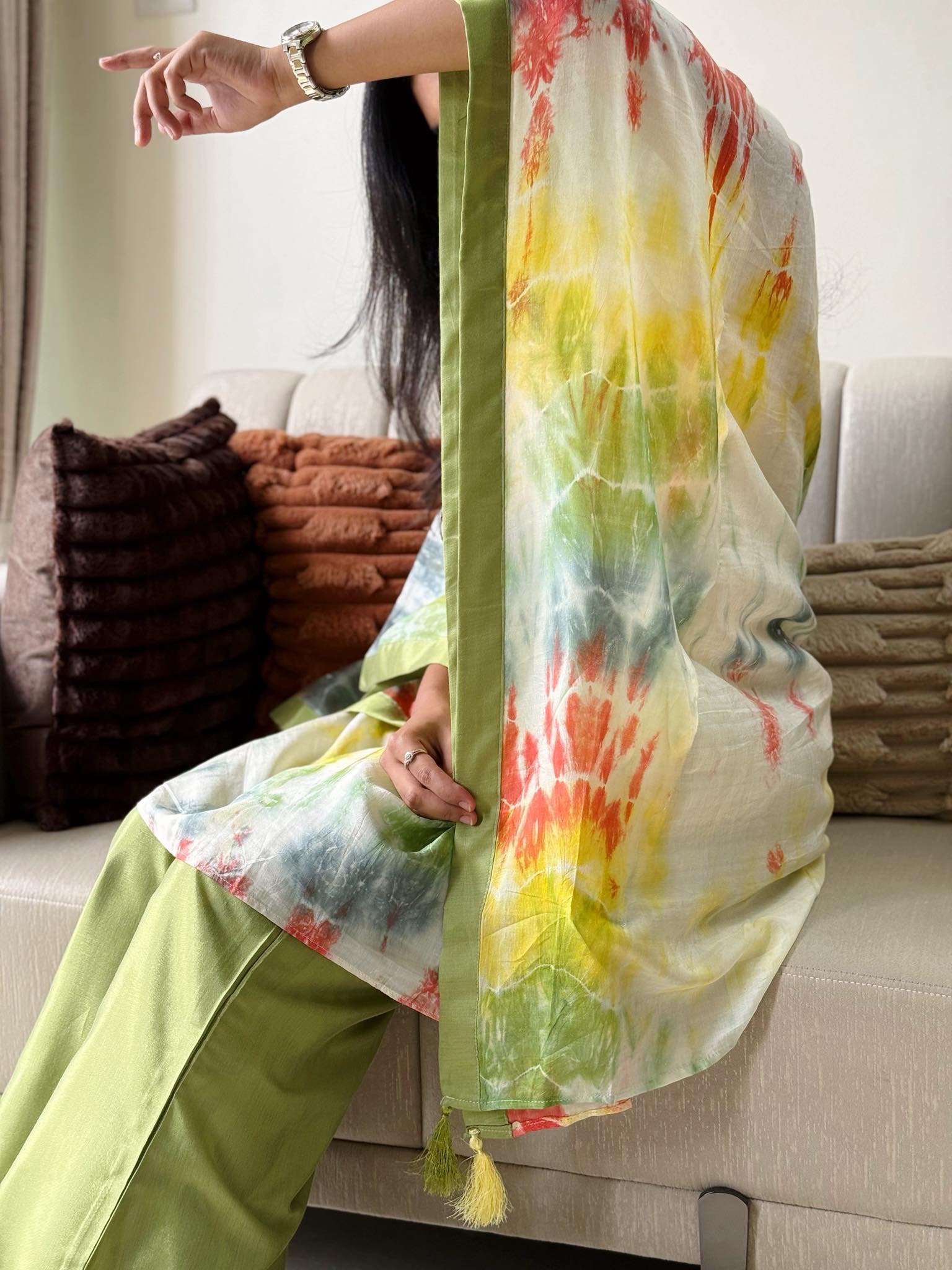 Elevate your wardrobe with this luxurious Tie Dye Silk Kaftan Set, designed for effortless elegance and all-day comfort. Crafted from premium, lightweight silk, each piece features a unique hand-dyed pattern, giving every set its own artistic character. The flowing kaftan silhouette drapes beautifully on all body types, while the coordinated bottoms complete the look with refined ease.
