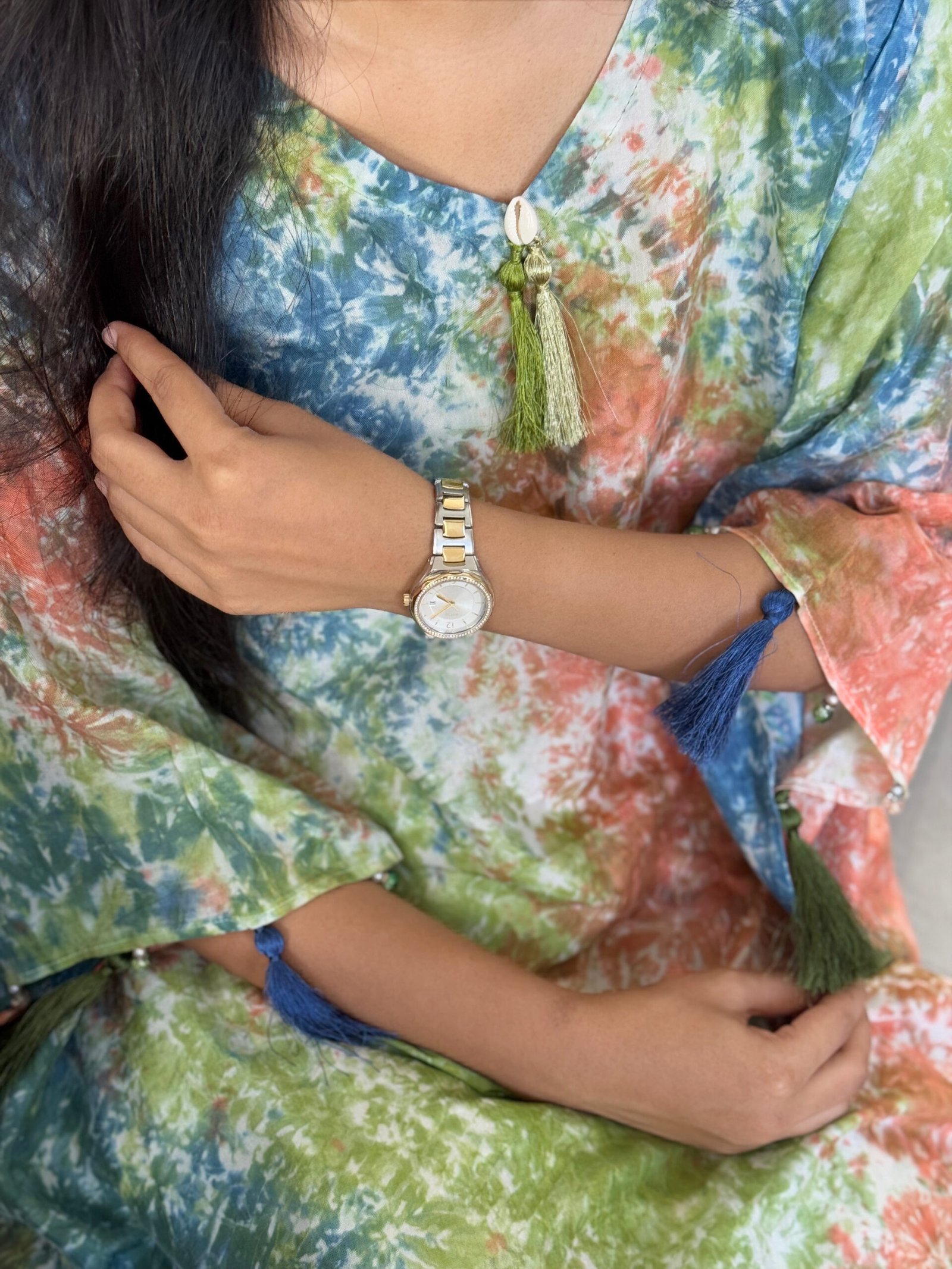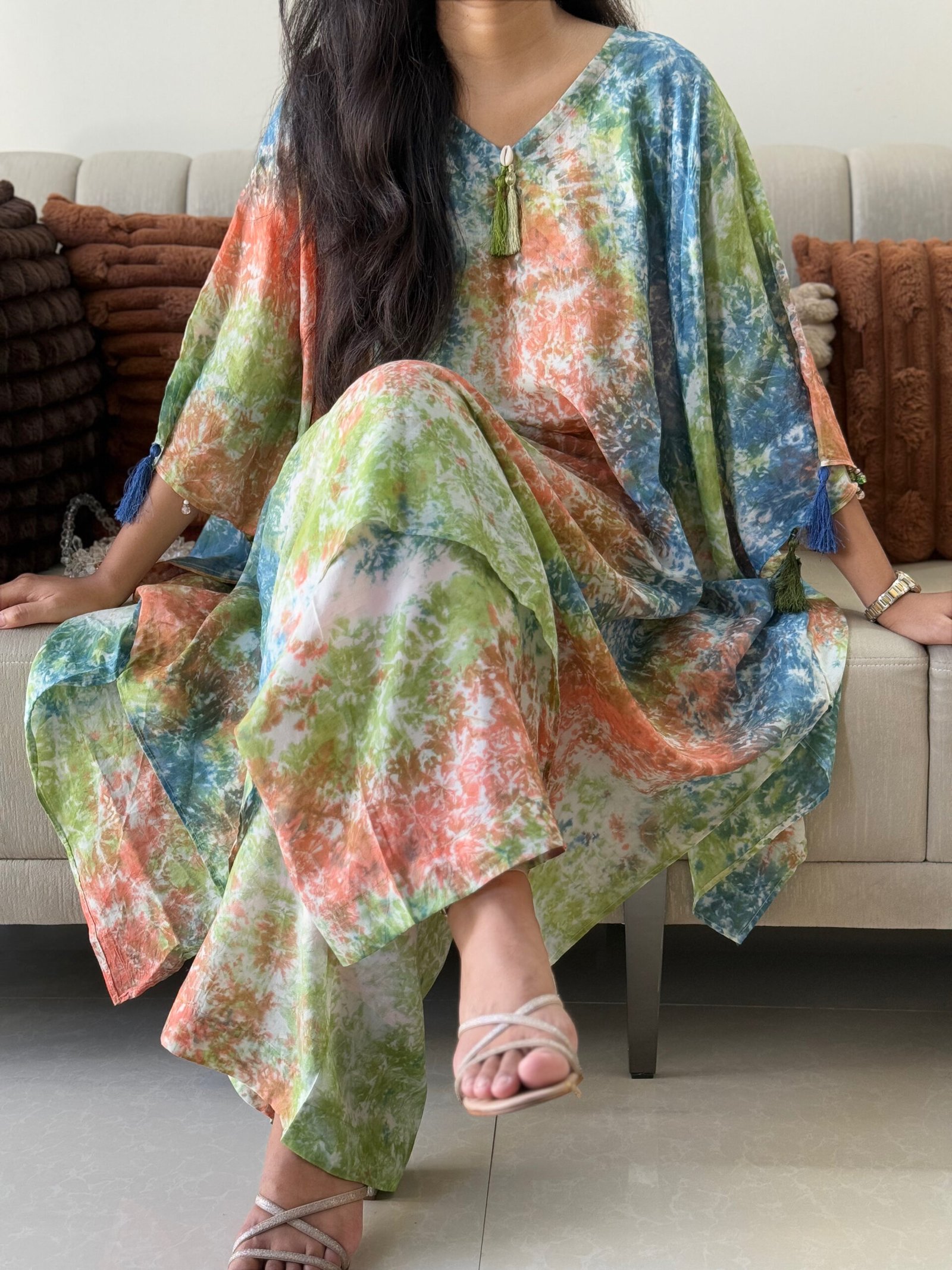 Experience the perfect blend of artistry and luxury with this Tie Dye Silk Kaftan Set.